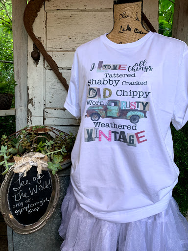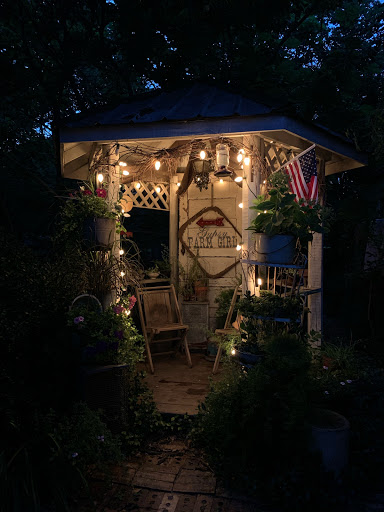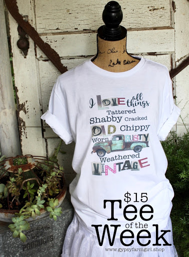 We took to Facebook and Instagram LIVE to announce this week's new Tee of the Week. Of course, we were in our very rustic, shabby, chippy gazebo to make the announcement this week! Here's a picture of it later in the evening...