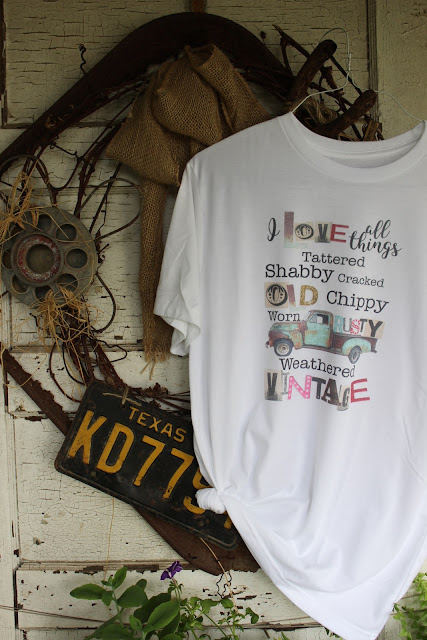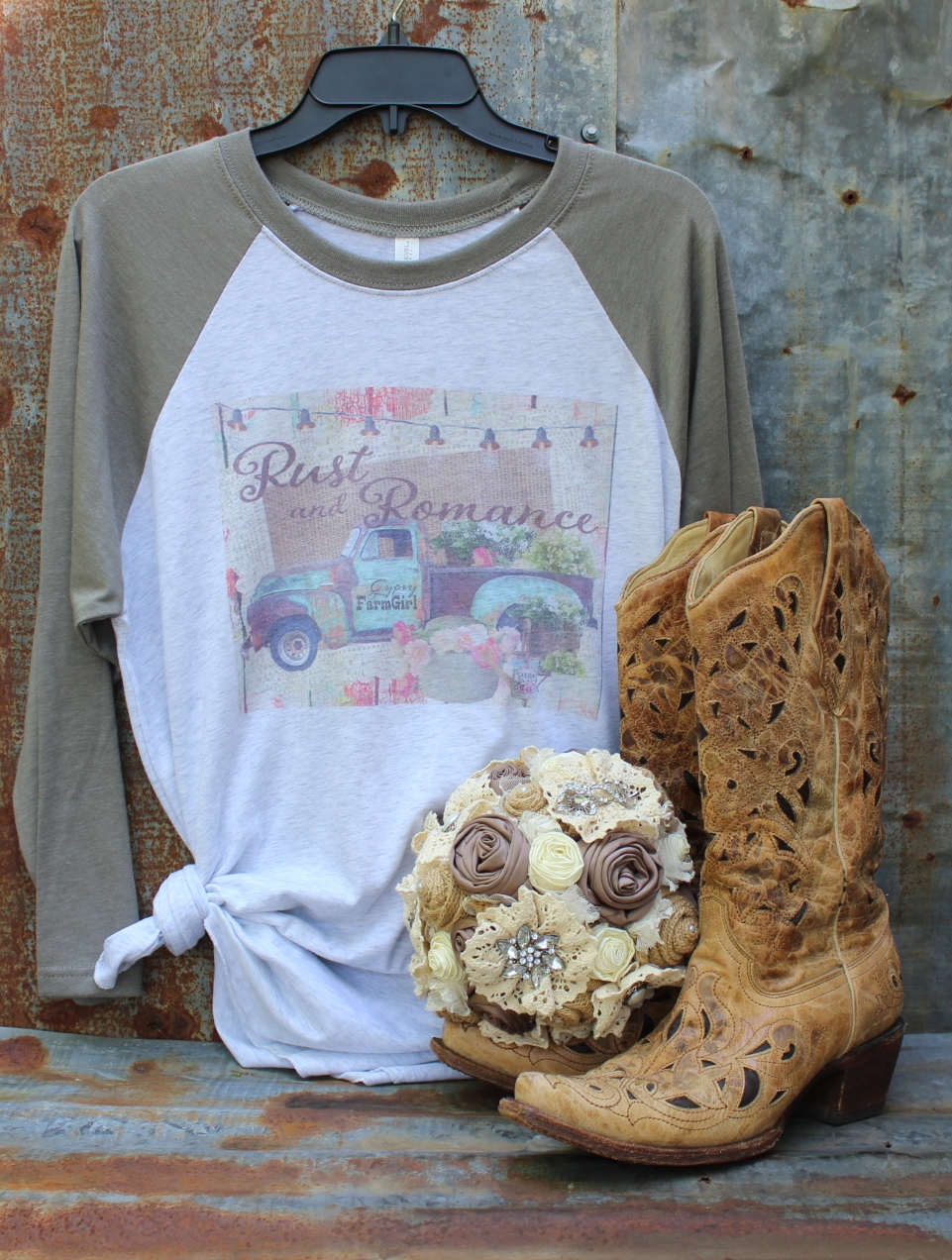 This shirt design had been one of the top sellers recently. It's got lots of things we love all rolled into one graphic tee - turquoise and rusty old truck, galvanized buckets and crates of flowers, burlap, lace, chippy wood and lights.
