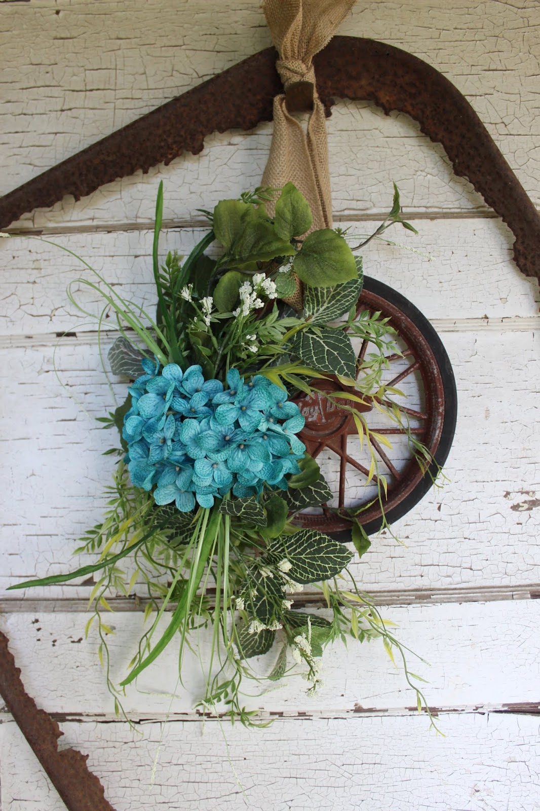 We were out junkin' one day and doing some picking in a old barn. We got excited when we found an old wheel. The lady said she would "love to see inside our head" so she could understand what we saw and why we got so excited about the random things we found. Well, I was seeing a funky junk wheel wreath! It sold quickly and everyone loved it. Jeff produced a couple more wheels from his junk stash out back and we made a couple more! This wheel came from a golf club caddy - how and where those came from, I really can't tell you, because we don't golf!