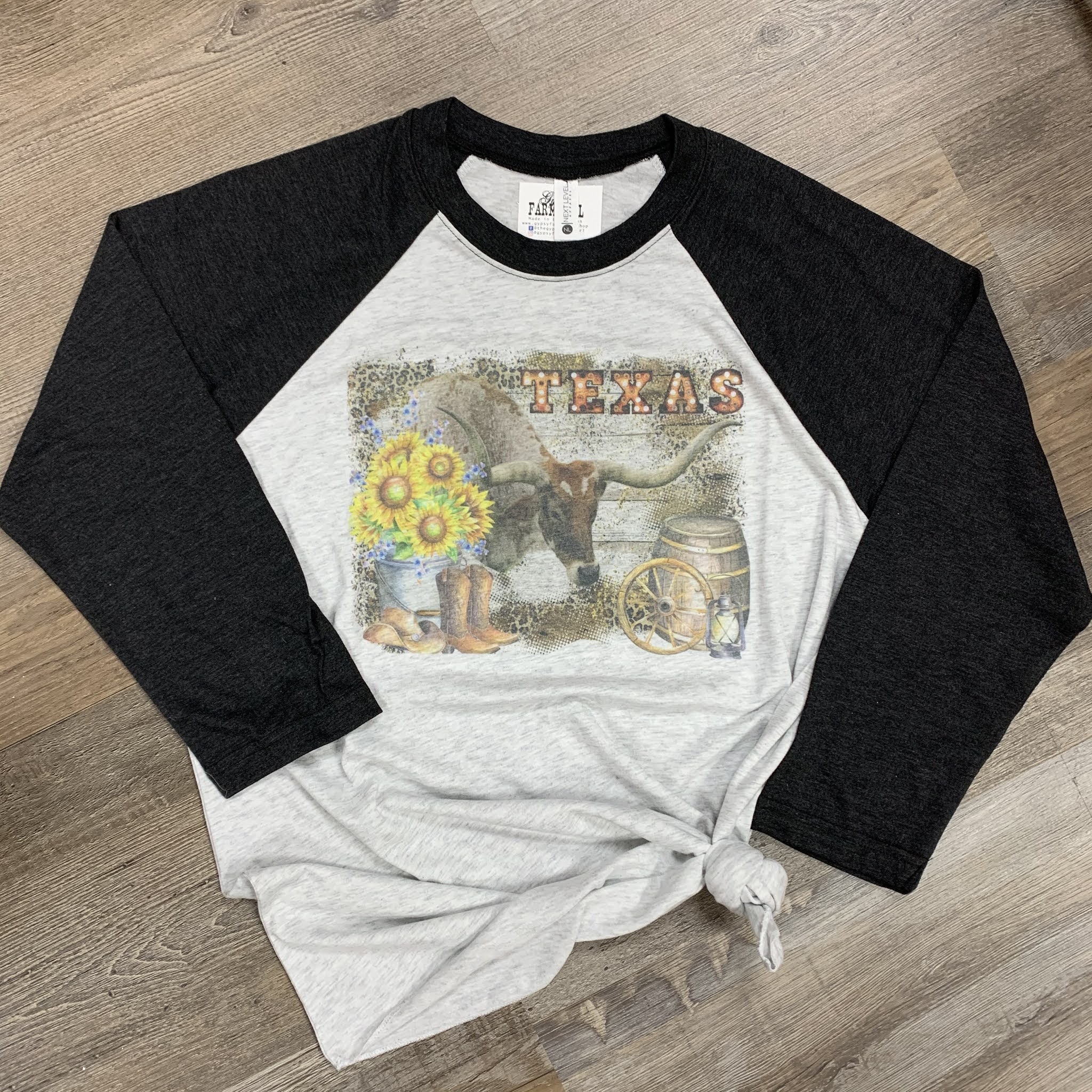 This design is special to me - I had a request for a tee with a longhorn cow. I looked for longhorn graphics, but couldn't find any that tickled my fancy. That's when we recalled taking pictures of Longhorns along the Ennis Bluebonnet Trails in 2011 or 12, so we took the picture, edited it, and worked it onto a new, original design.