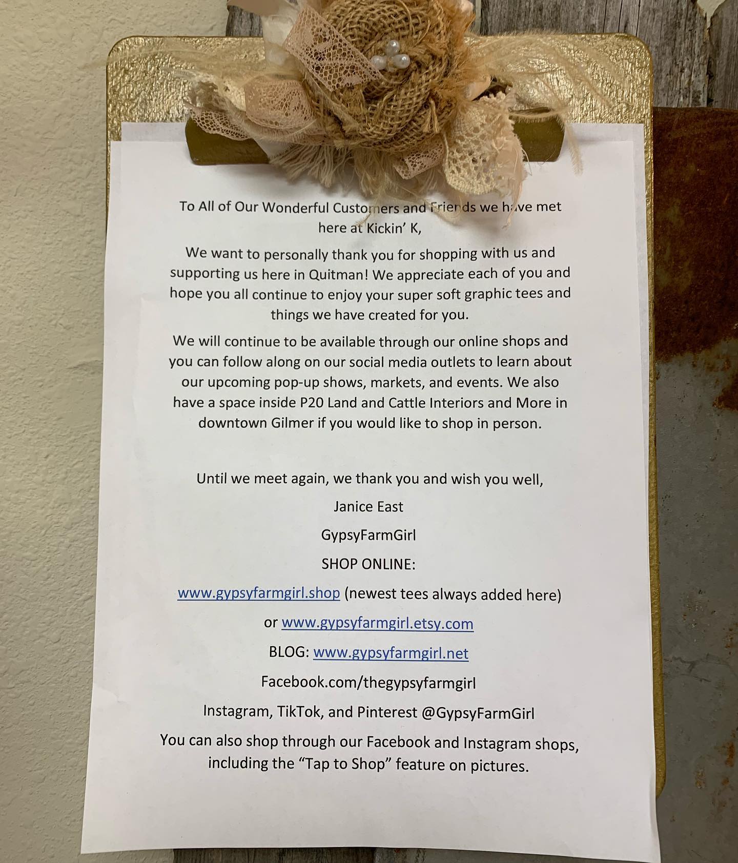 We want to remind everyone that our shop is always online (www.GypsyFarmGirl.shop + etsy shop www.gypsyfarmgirl.etsy.com) and we’d be happy to continue creating fun tees for all of you. We also have a space in Gilmer at P20 Land and Cattle Interiors and More, if you would like to make a little road trip to shop in person and we’ll be doing some pop up shows and events (we’ve got things in the works.) Just to be clear, just this booth location at Kickin’ K is closing and not our business as a whole.