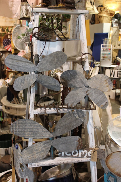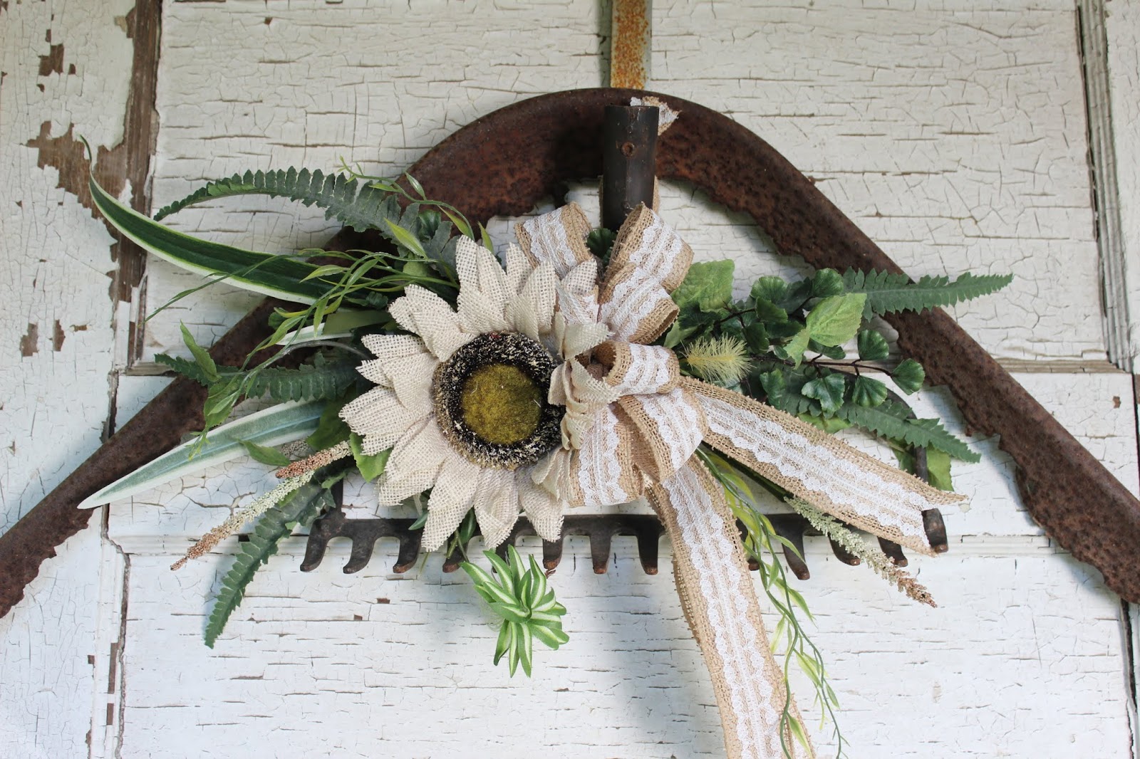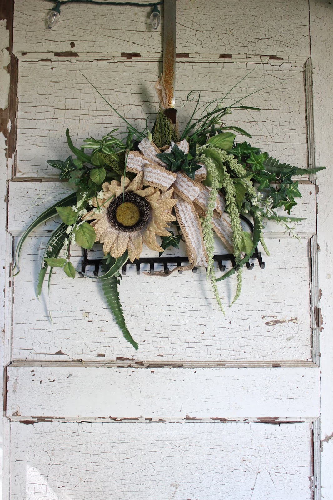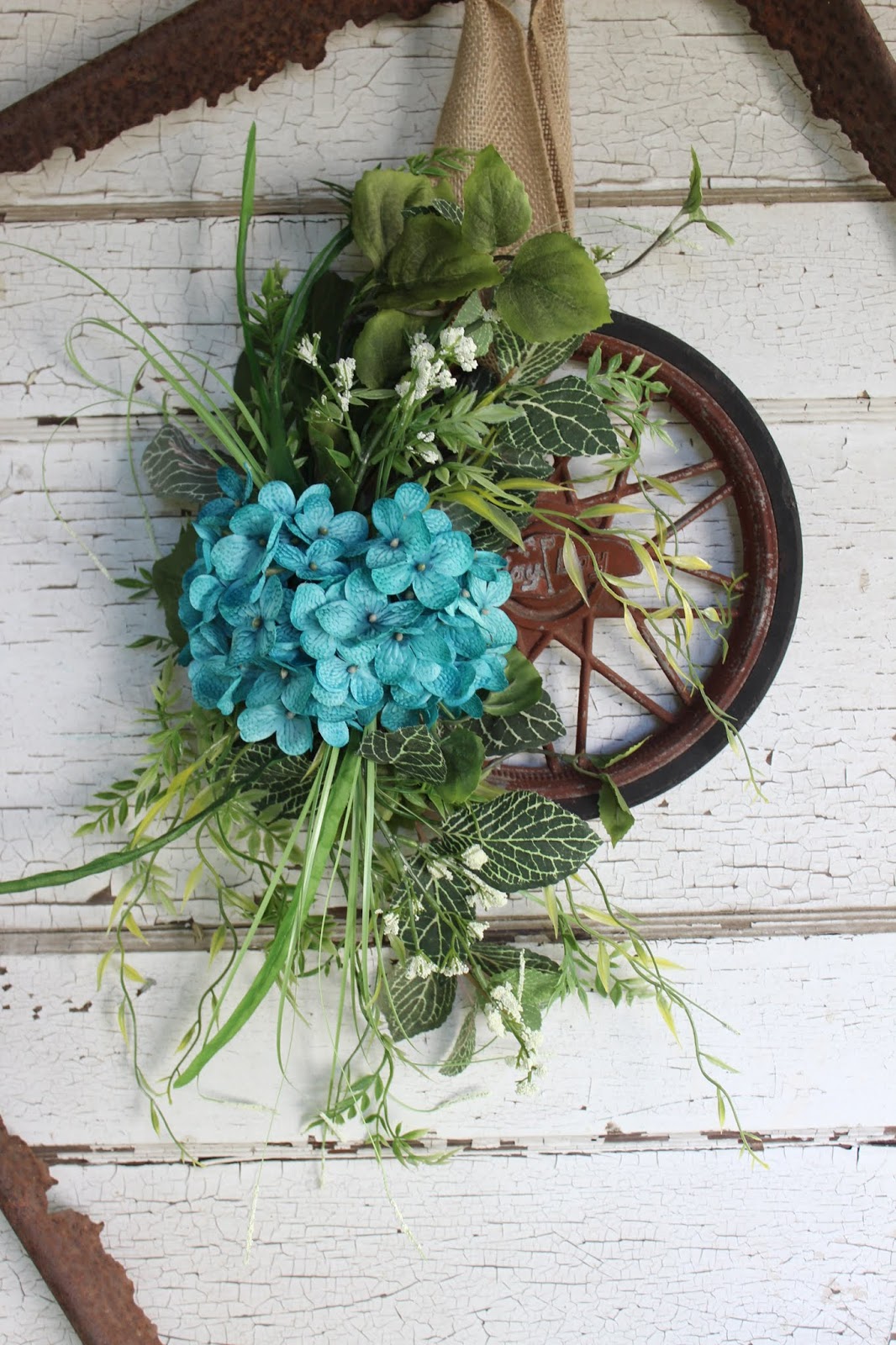Speaking of rusty, weathered and worn things... we've created some door wreath alternatives with old wheels and garden rakes