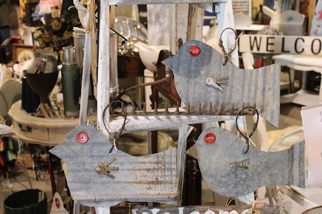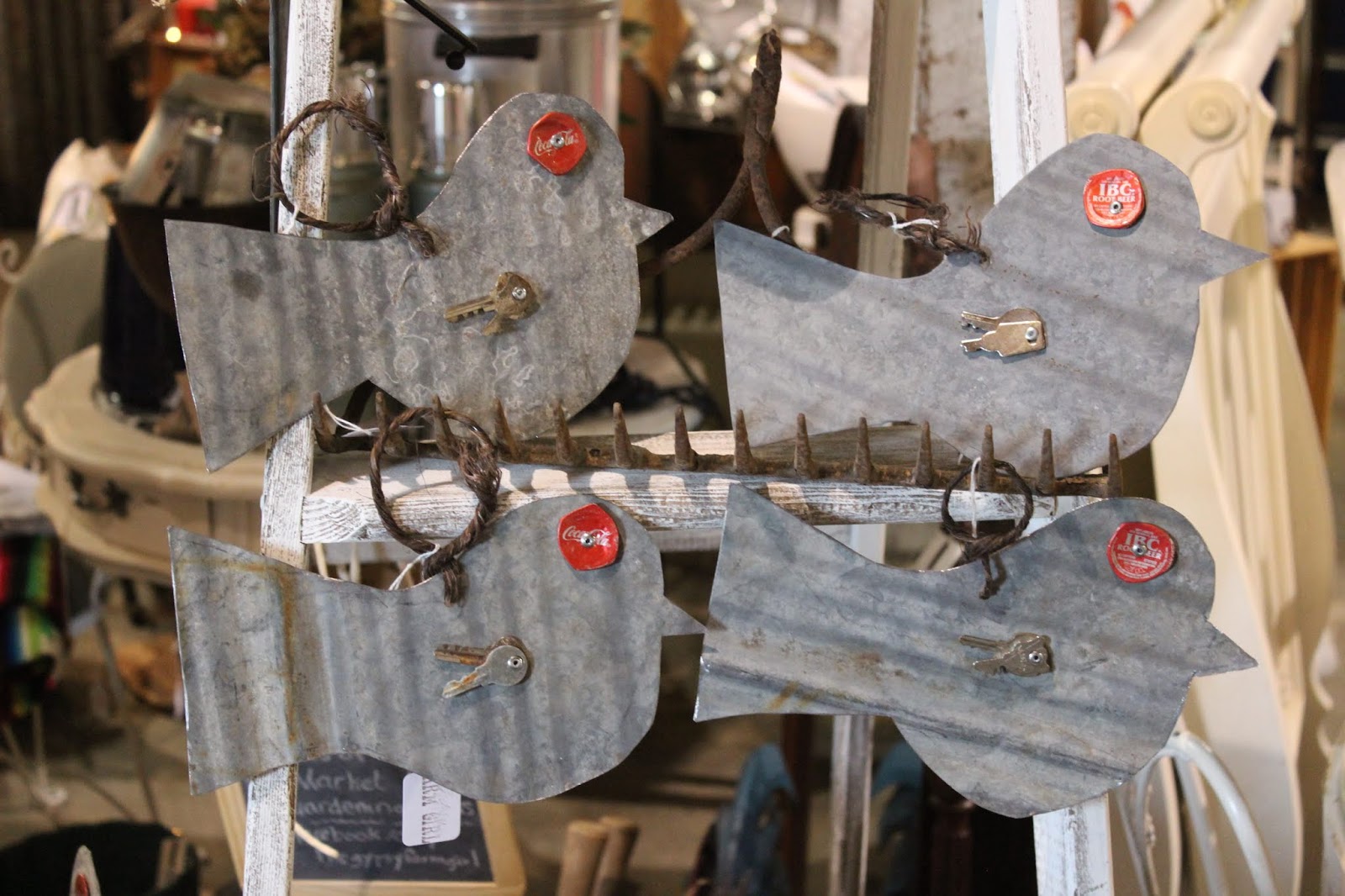 And because we can't let old barn tin go to waste, just because granddaddy's old hay barn came down in jagged and torn pieces, we made tin birds with keys for wings and bottle cap eyes. This is the first time the tin birds have been listed online. I've made the birds on yard stakes before, but the shipping cost was outrageous for a big box, so we just sold those in person at our events. The last time we made birds, we decided some would be on wire hangers, so they can easily be shipped and you can hang them anywhere you want to! With two sizes, I'm calling them the "mama birds" and "baby birds!"
