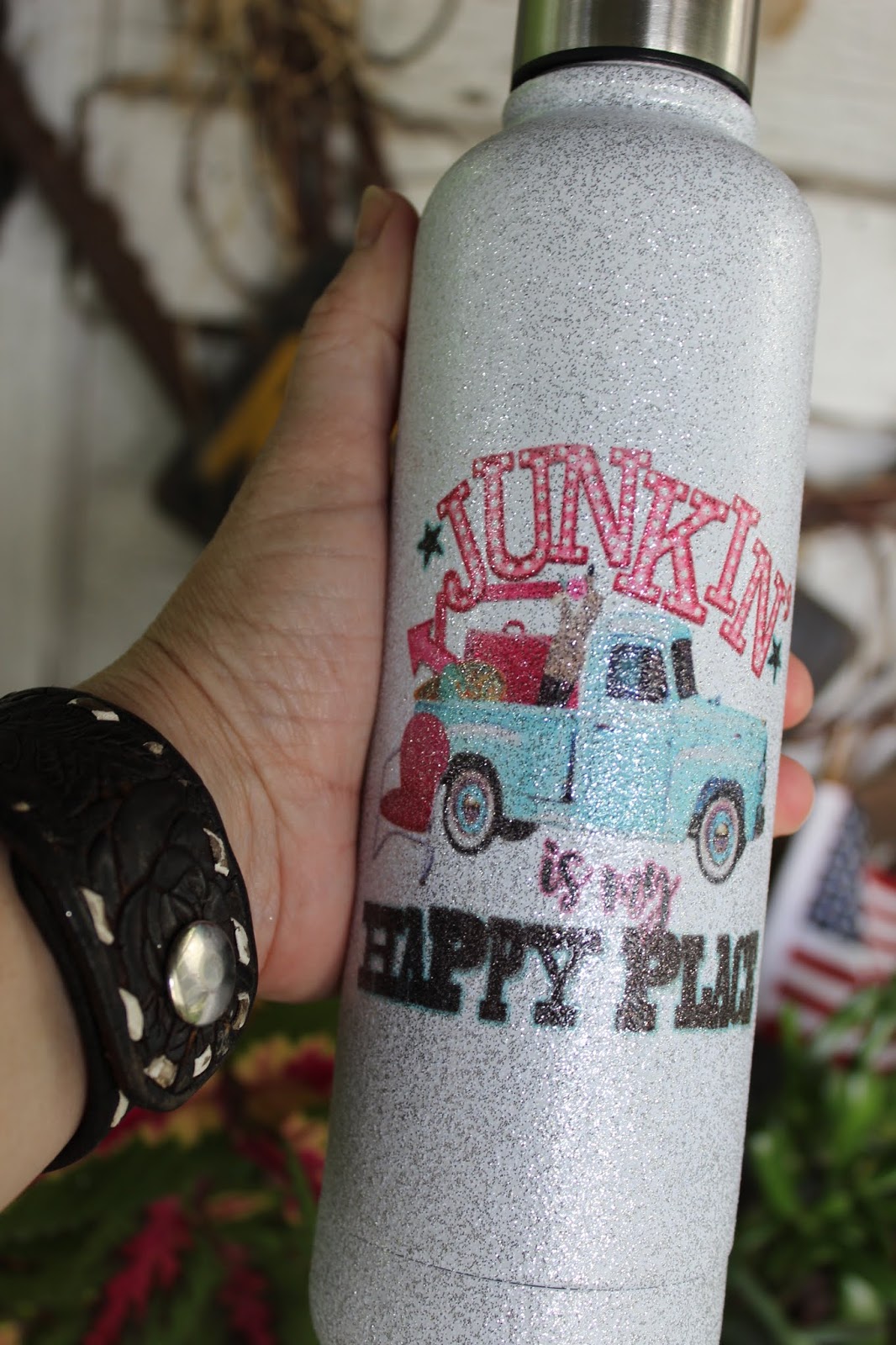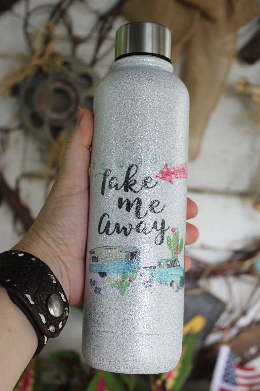 Now even though we love rust, sometimes we need a little sparkle! These new stainless steel water bottles have the glitter effect with vintage style graphics. We never leave home, without taking water or tea with us. With it being summer time, I often need more than one cup, so these water bottles are great to take a refill. When we were at our show last week, I filled my big tumbler with ice tea and took two bottles of water in my bag. I love that they are stainless steel and reusable. There is a very limited quantity of these, so grab them now!