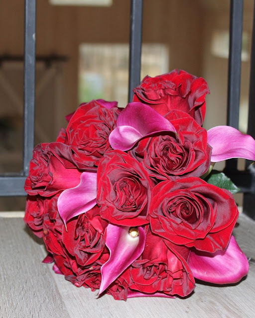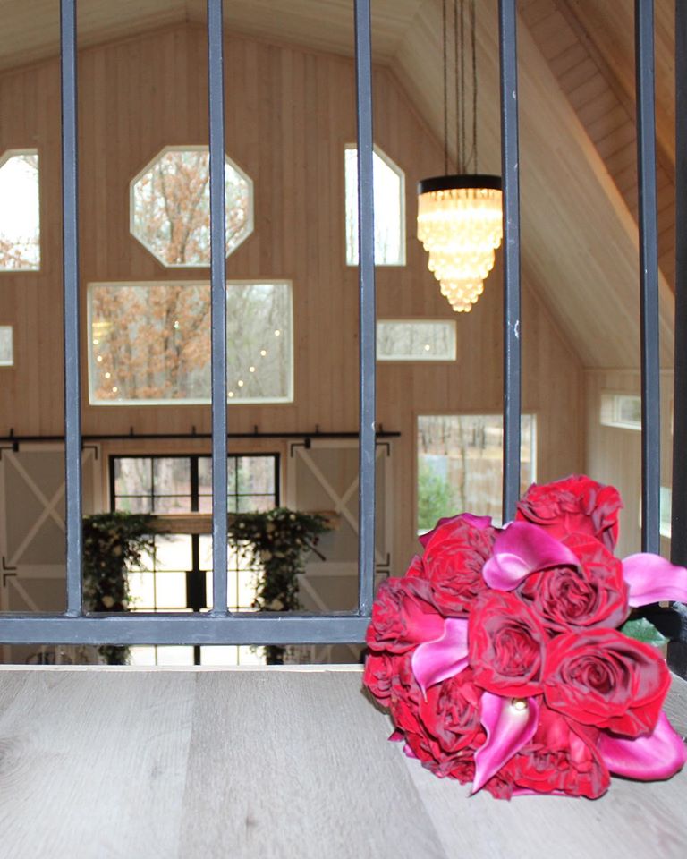 The view from the second story...The bridesmaids carried bouquets of burgundy roses and callas.