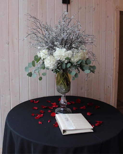 Hydrangeas and iced branches comprised the entryway arrangement, where guest would sign in.