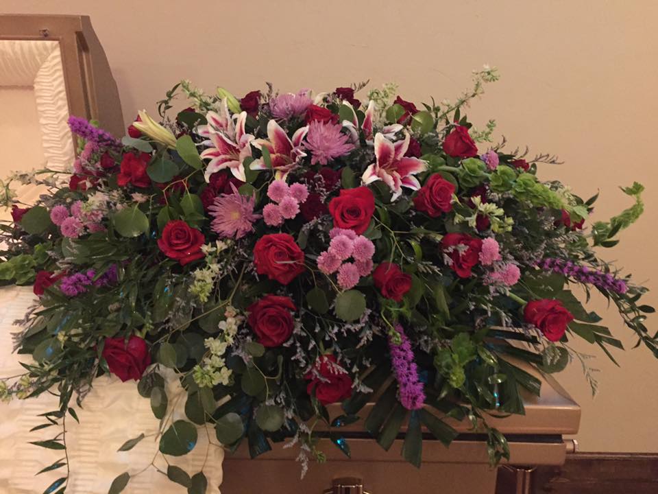 I knew she had picked out a pink or red dress to be buried in, so I decided to go with a mixture of red roses, stargazer lilies, along with pink and purple mixed flowers.