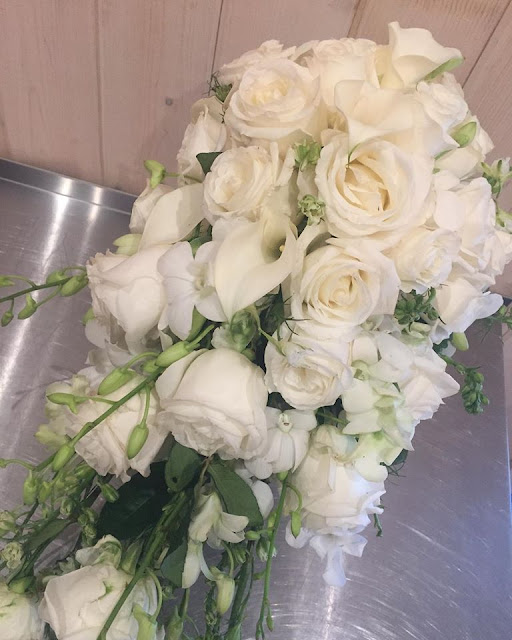 The bridal bouquet was a cascade style arrangement with white roses, callas, and orchids. (Can't wait to see a picture of the bride carrying the bouquet, since I didn't get a great pic of it.)